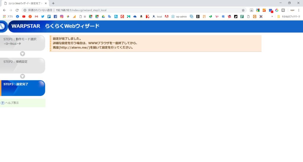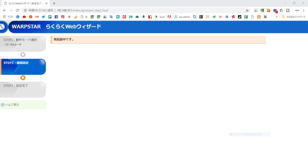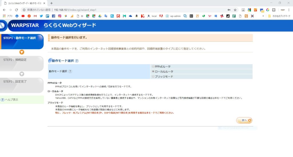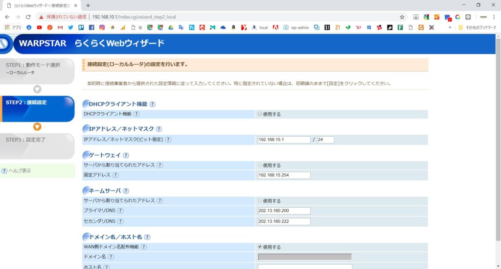 ルーターの設定画面に従って必要な情報を入力していきます。部室の場合、学内LAN内にさらにLANを設置する形になるので、「ローカルルータ」になります。