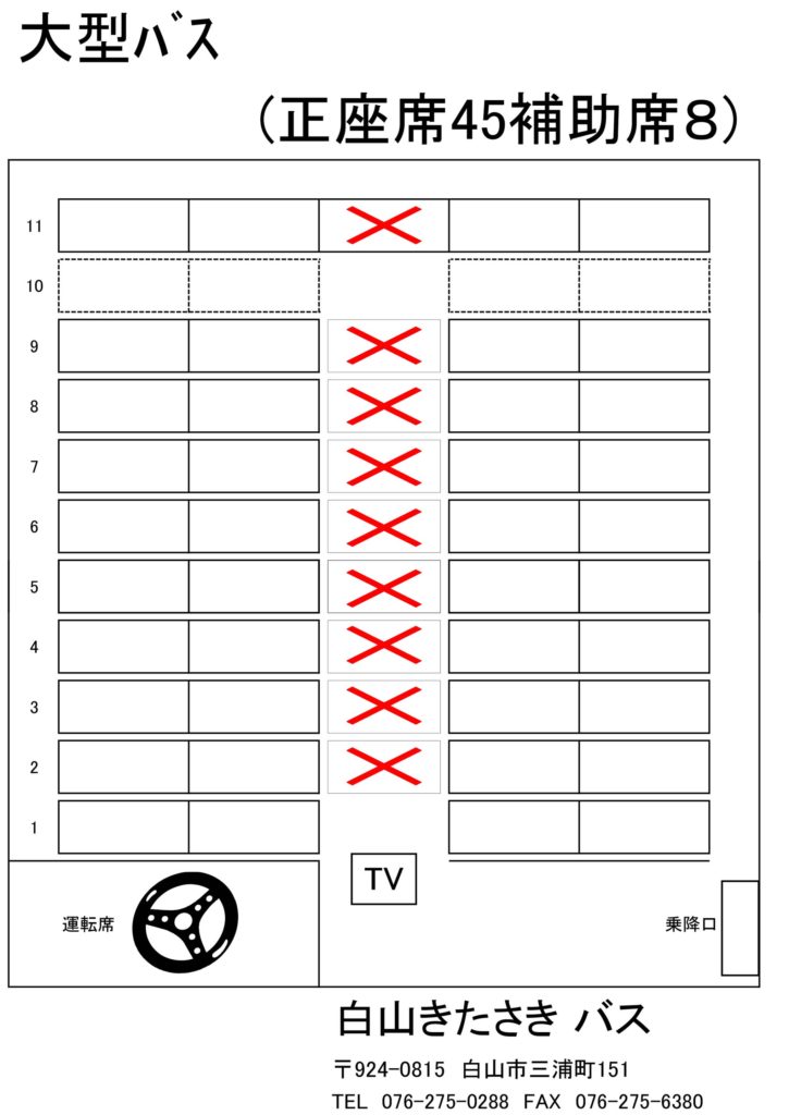 バスに乗る際は、バス備え付けのアルコール消毒液で手指を消毒してください。座席は自由ですが、×のところには座らないでください。