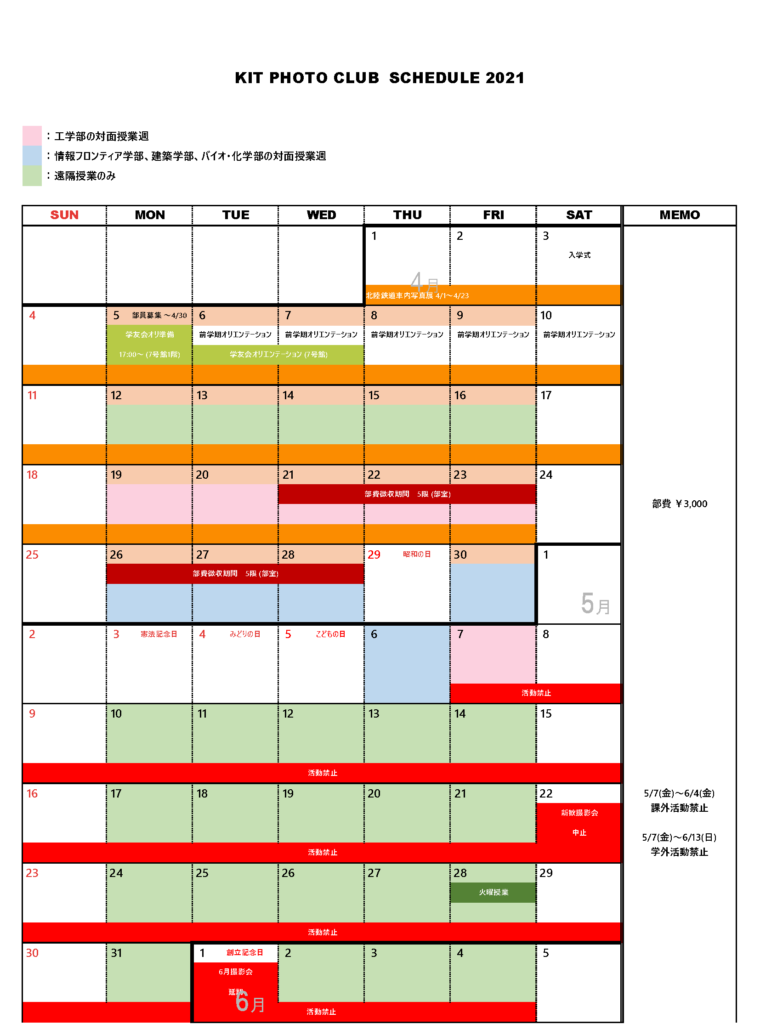2021年度前学期の活動スケジュールです。(5/25更新)