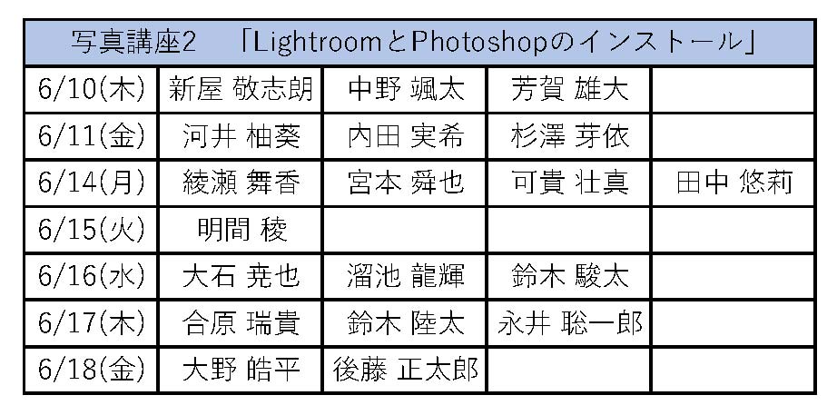 画像編集ソフトのLightroomとPhotoshopをインストールします。新入部員は必ず参加してください。2年生以上でインストールしたい人がいれば、角川まで連絡してください。