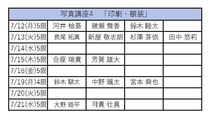 日時:6/16(水)~6/23(水) 5限 7/12(月)~7/21(水) 5限(7/19は4限)