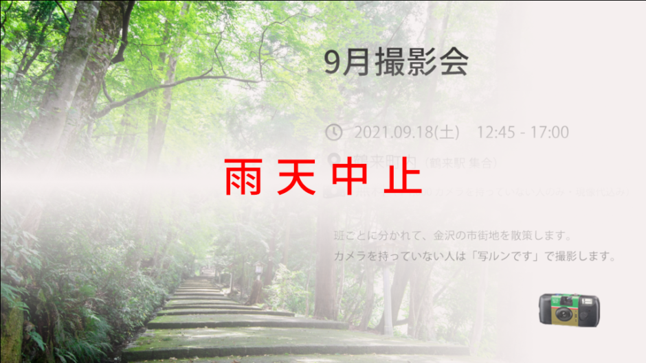 雨天延期に伴い、9/26(日)に9月撮影会を開催します。班ごとに分かれて鶴来の市街地を散策して撮影します。当日の交通費は各自で準備してきてください。