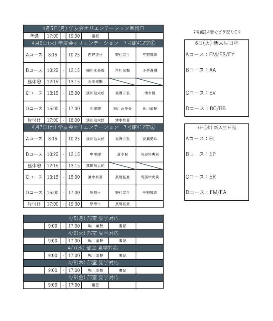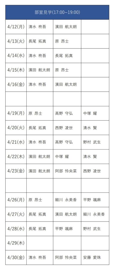 今年度の部室見学期間は4/5(月)~4/30(金)(土日祝除く)です。4/5(月)~4/16(金)は主に運営で部室見学対応を行います。4/19(月)~4/30(金)は以下のシフトの通り対応します。