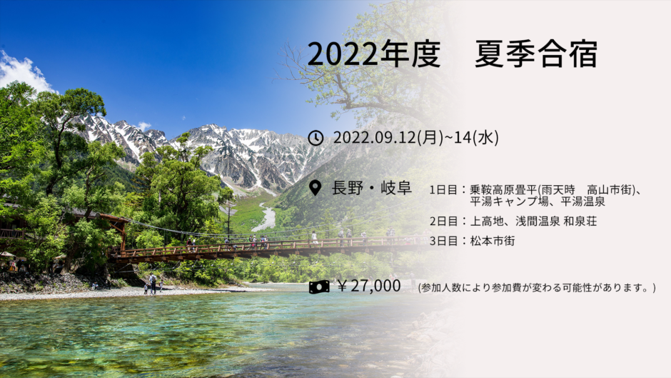 今年の夏季合宿は9月12日(月)~14日(水)の2泊3日で、長野県と岐阜県に行きます。詳細は以下の通りです。