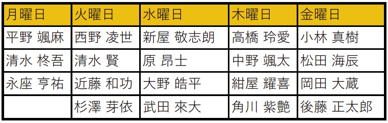 表の通り実施します。自分の時間が始まる5分前には部室に来てください。円滑な撮影へのご協力お願いします。