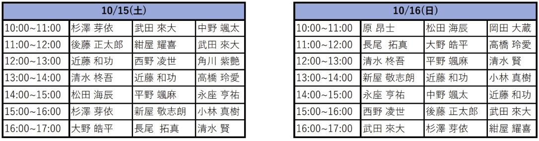 工大祭写真展の店番を行うシフトを作製しました。参加不可能な時間帯に割り振られた人は部長や書記などの運営に連絡してください。