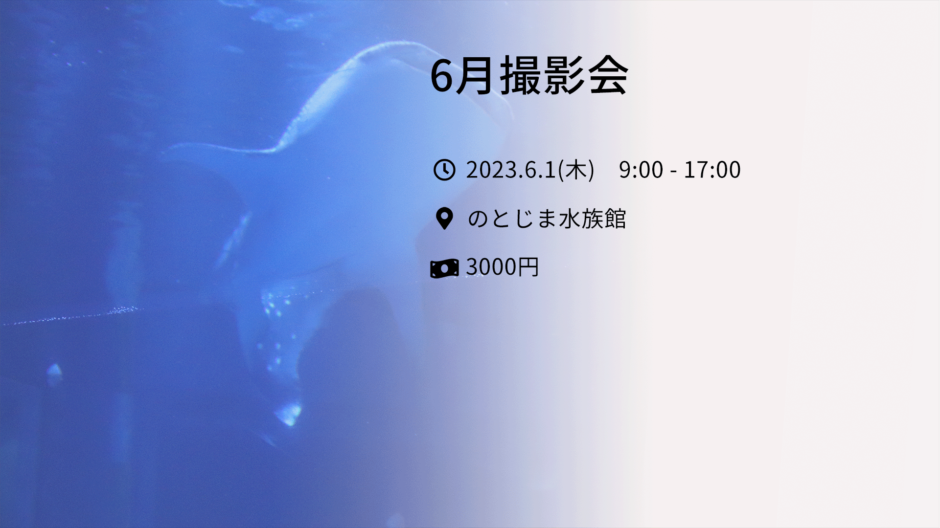 6月撮影会を6/1(木)にのとじま水族館で開催します。班ごとに分かれて撮影します。参加費は当日回収するので、お釣りのないように準備してきてください。