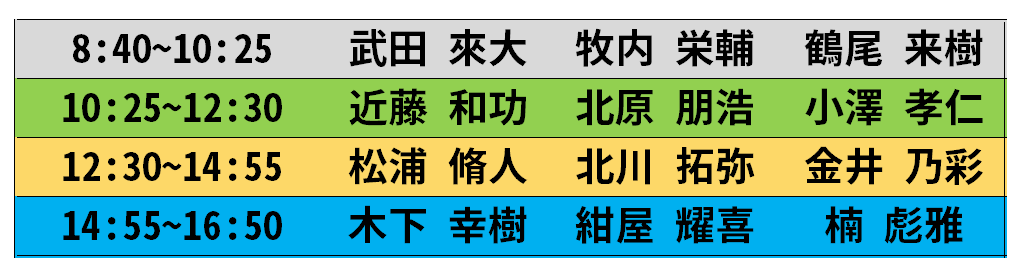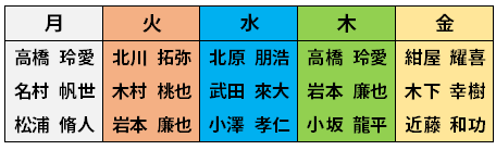 4月5日のシフト表です。変更等ありましたら1年生のグループで相談お願いします。