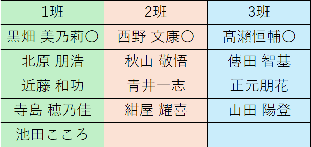 班は以下の通りで、名前の横に丸印の付いている学生が班長です。